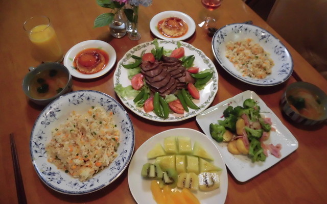昨日の旦那さんごはん 大好物のローストビーフにしました おかずにはならないから その分 他のお料理を ごはんに合う系で献立 献立 自家製ローストビーフ ジャポネソース じゃがいもの揚げ出しそぼろ煮 きんぴられんこん 花型の卵焼き